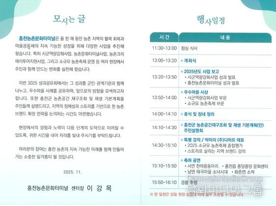 성과 발표에서는 (사)홍천농촌지역관광사업단이 홍천농촌문화터미널을 위탁 운영하며 추진한 지역단위 농촌관광사업, 소규모 농촌축제 지원사업, 2025년 시군역량강화사업 추진 성과 발표와 우수마을 시상이 진행된다.