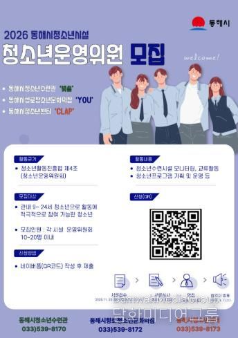 시민행정신문 강갑수 기자 | 동해시는 2026년 동해시청소년시설(동해시청소년수련관, 동해시향로청소년문화의집, 동해시청소년센터)에서 활동할 신규 청소년운영위원을 모집한다.