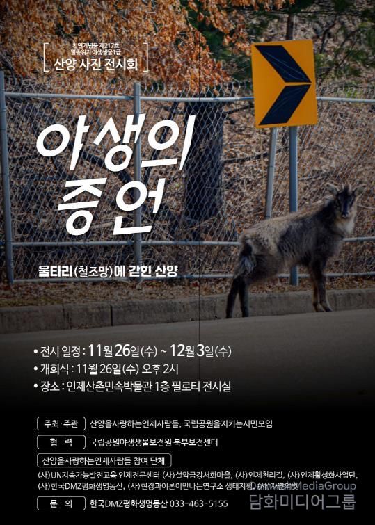 시민행정신문 강갑수 기자 | ‘산양을 사랑하는 인제 사람들’과 ‘국립공원을지키는시민의모임’은 오는 11월 26일부터 12월 3일까지 인제산촌민속박물관 1층 필로티 전시실에서 ‘야생의 증언 – 울타리(철조망)에 갇힌 산양(천연기념물 제217호, 멸종위기 야생생물 1급)’ 사진전을 개최한다.