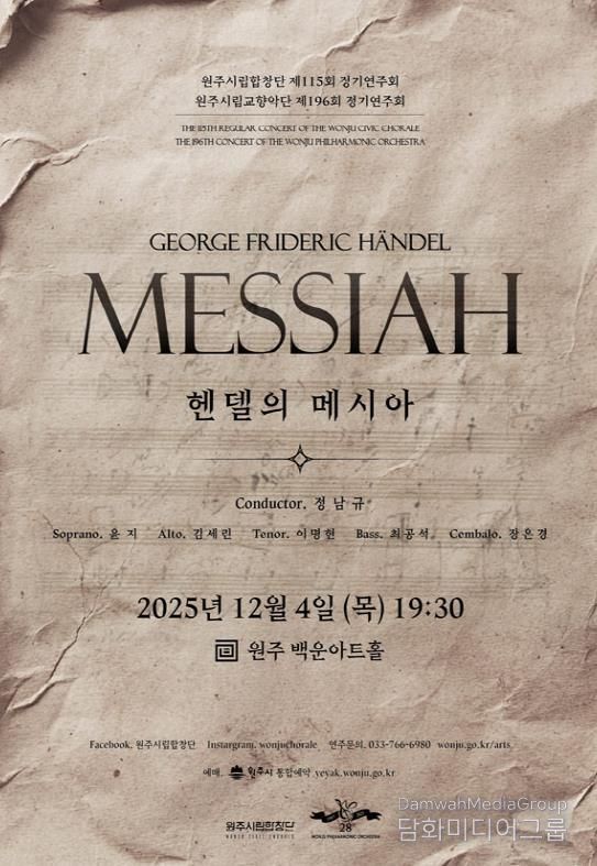 시민행정신문 기자 | 원주 시립합창단과 시립교향악단은 오는 12월 4일 오후 7시 30분 백운아트홀에서 정기연주회 ‘헨델의 메시아’를 개최한다.