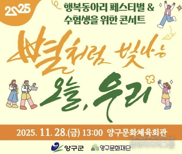 시민행정신문 기자 | 양구군과 양구문화재단이 공동으로 추진하는 ‘2025년 행복동아리 페스티벌 & 수험생을 위한 콘서트 '☆처럼 빛나는 오늘, 우리'’를 28일 오후 1시 문화체육회관에서 개최한다.