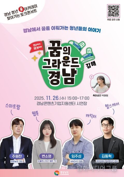 시민행정신문 강갑수 기자 | 경남도는 26일 오후 3시 김해 경남콘텐츠기업지원센터 시연장에서 청년을 위한 ‘꿈의 그라운드 경남 찾아가는 토크 콘서트’를 개최한다.