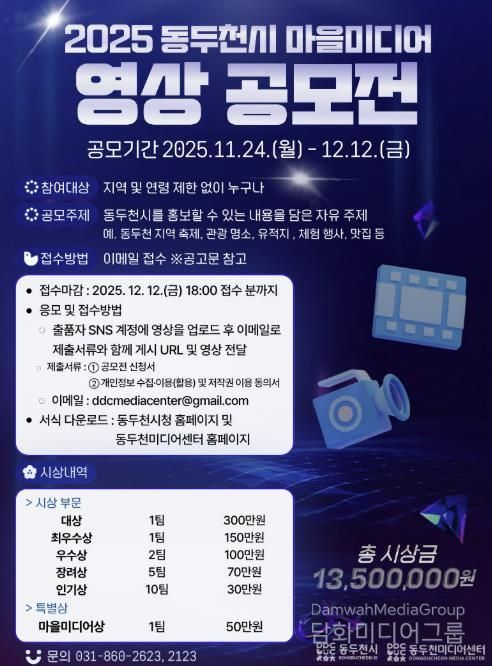 동두천미디어센터 관계자는 “이번 공모전이 시민과 전국의 창작자들이 바라본 동두천의 새로운 매력을 발견하는 계기가 되길 바란다”라며 “창의적인 영상 콘텐츠를 통해 동두천의 감동과 가치를 널리 알리는 기회가 되길 기대한다”라고 말했다.