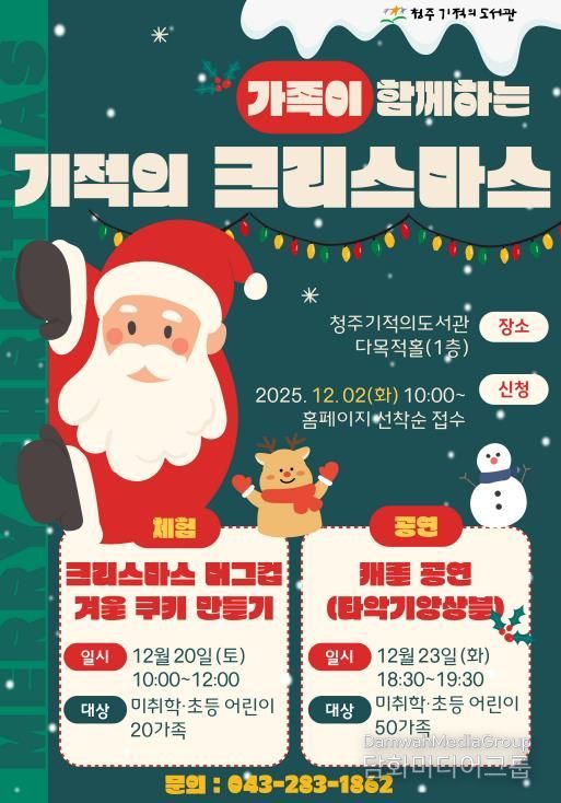 시민행정신문 기자 | 청주기적의도서관은 오는 12월 20일과 23일 청주기적의도서관 다목적홀(1층)에서 ‘가족이 함께하는 기적의 크리스마스’ 행사를 개최한다.