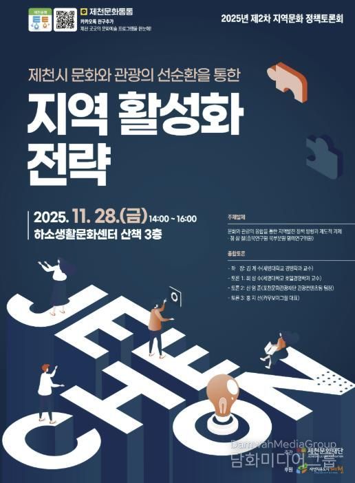 시민행정신문 강갑수 기자 | 제천문화재단은 오는 2025년 11월 28일 오후 2시, 하소생활문화센터 3층 산책홀에서 '2025년 제2차 지역문화 정책토론회'를 개최한다고 밝혔다. 이번 토론회는 문화와 관광의 유기적 연계를 통해 지역경제를 활성화하고, 지속 가능한 지역문화 기반을 확장하기 위한 전략을 논의하기 위해 마련됐다.