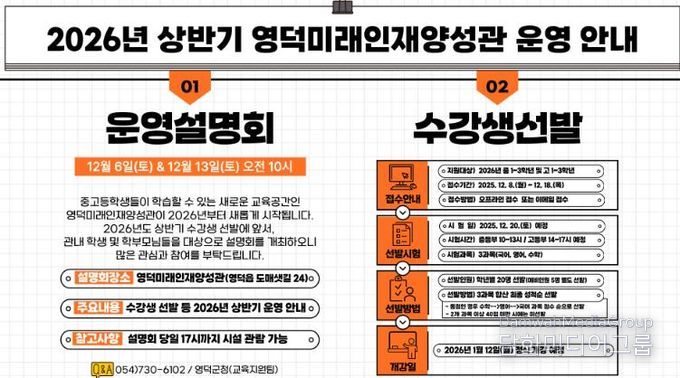 이에 영덕군은 오는 12월 6일과 12월 13일 오전 10시, 두 차례에 걸쳐 운영설명회를 열며, 설명회 당일에는 시설을 전면 개방해 학생과 학부모가 양성관 내부를 직접 둘러볼 수 있도록 할 예정이다.