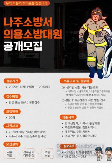 시민행정신문 강갑수 기자 | 나주소방서는 지역사회의 안전을 책임질 “2025년 하반기 의용소방대 신규대원 모집”에 나선다. 모집 기간은 오는 12월 1일부터 20일까지이며, 신천서류는 나주소방서 홈페이지 또는 나주소방서를 비롯한 119안전센터에서 지원 서류를 배부하고 접수를 진행한다.
