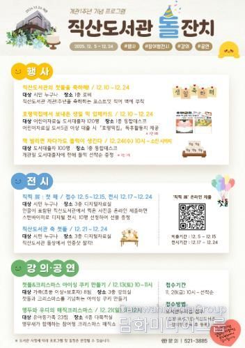 직산도서관 관계자는 “크리스마스 선물처럼 찾아간 직산도서관이 지역주민들의 따뜻한 관심과 사랑 덕분에 1년을 뜻깊게 보낼 수 있었다”며 “앞으로도 응원에 힘입어 양질의 도서와 수준 높은 프로그램으로 지역주민들과 함께할 것”이라고 말했다.