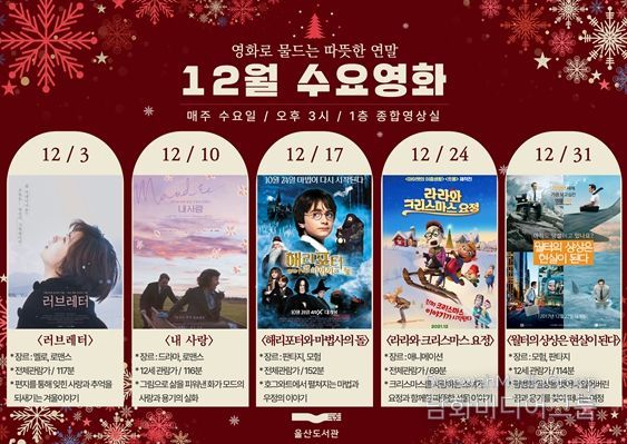시민행정신문 강갑수 기자 | 울산도서관이 12월 한 달 동안 ‘영화로 물드는 따뜻한 연말’을 주제로 매주 수요일 오후 3시 도서관 1층 종합영상실에서 수요영화를 상영한다.