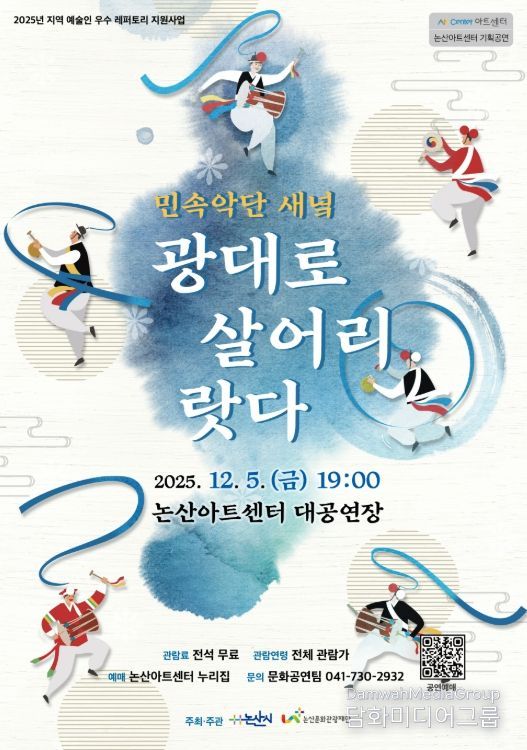 시민행정신문 강갑수 기자 | (재)논산문화관광재단은 오는 12월 5일 19시에 논산아트센터 대공연장에서 ‘민속악단 새녘 '광대로 살어리랏다'’ 공연을 진행한다고 밝혔다.
