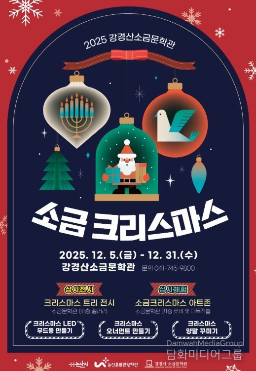 시민행정신문 강갑수 기자 | (재)논산문화관광재단이 주관하는 강경산 소금문학관이 크리스마스를 앞두고 관람객들에게 따뜻한 연말 분위기를 선사할 크리스마스 트리 전시와 특별 문화예술 프로그램을 선보인다.