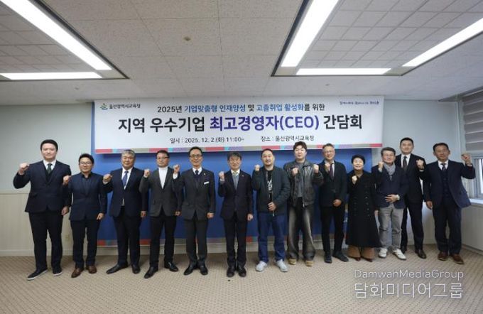 울산교육청은 2일 접견실에서 ‘2025년 하반기 기업 최고경영자(CEO) 간담회’를 열고 ㈜에스케이인더스트리, 고려기술㈜, ㈜센트럴코리아, ㈜옛간, 프롬유헤어, ㈜고담, 울산엘리야병원, ㈜인흥산업, 알트코리아㈜, 일진기계㈜의 최고경영자 10명과 간담회를 가졌다.