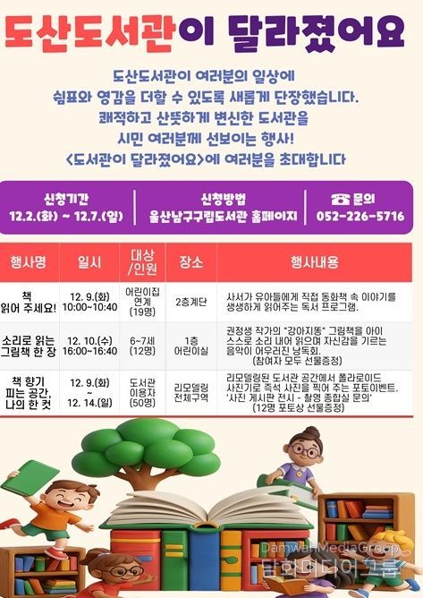 시민행정신문 강갑수 기자 | 울산 남구 도산도서관은 부분 리모델링을 통해 한층 더 쾌적하고 편안한 독서환경을 조성하고 시민들이 책과 문화를 함께 즐길 수 있는 열린 공간으로 거듭나 이를 기념하는 ‘도산도서관이 달라졌어요’ 행사를 9일부터 14일까지 운영한다고 밝혔다.