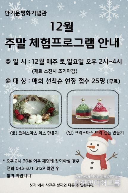 시민행정신문 강갑수 기자 | 음성군 제8대 유엔사무총장 반기문 평화기념관에서는 관람객에게 다채로운 즐길 거리를 제공하기 위해 12월 크리스마스를 주제로 주말 무료체험 프로그램을 운영한다.