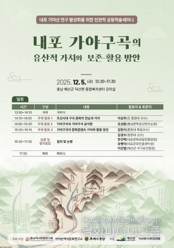 시민행정신문 강갑수 기자 | 충남역사문화연구원과 가야산역사문화연구소가 공동으로 주최하는 내포 가야산 연구 활성화를 위한 민관학 공동학술세미나가 오는 12월 5일에 오후 13시 예산군 덕산면 종합복지센터 강의실에서 개최된다.