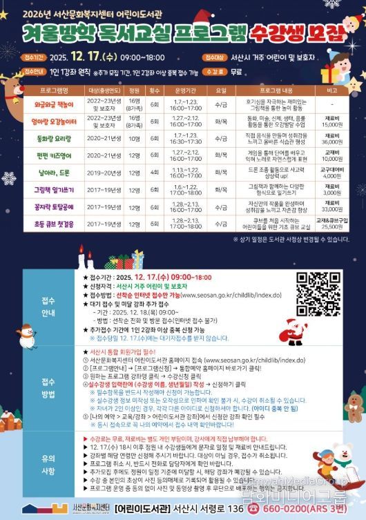 시민행정신문 강갑수 기자 | 서산문화복지센터는 서산 시민을 대상으로 2026년 1분기 교육프로그램, 겨울방학 독서교실 수강생을 새롭게 모집한다.