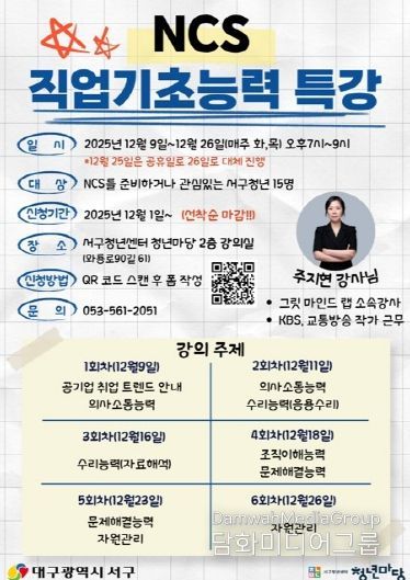 한편, 대구 서구청은 지난 11월 20일 서구 최초 청년 거점 공간인 ‘서구청년센터 청년마당’을 개소했으며 이번 'NCS(국가 직무능력 표준) 직업 기초 능력 특강'을 시작으로 청년들의 취업 준비와 소통, 문화 활동을 종합적으로 지원할 예정이다.