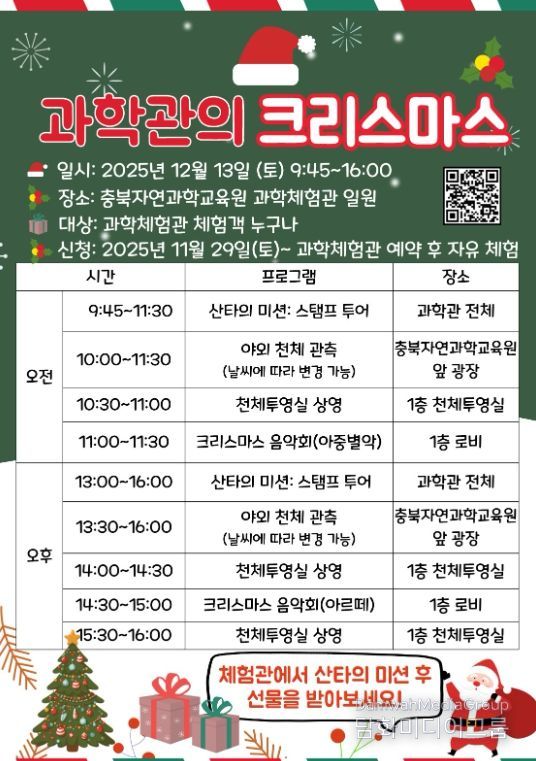 스탬프 미션, 천체 투영실 프로그램 등 다양한 활동이 더해져 관람객들이 과학적 호기심을 키우며 색다른 크리스마스 과학 체험을 즐길 수 있을 것으로 기대된다.