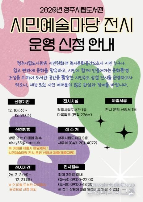 시민행정신문 강갑수 기자 | 청주시립도서관은 시민 누구나 쉽고 편하게 문화를 향유하고 시민이 함께 만들어가는 문화환경을 조성하기 위한 ‘2026년 시민예술마당 전시’ 운영자를 모집한다고 8일 밝혔다.