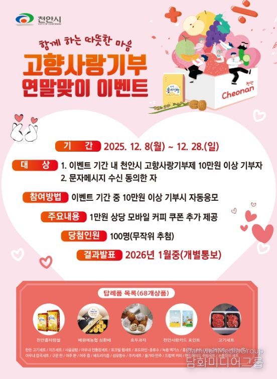 시민행정신문 강갑수 기자 | 천안시는 오는 28일까지 ‘고향사랑기부제 연말맞이 이벤트’를 진행한다고 8일 밝혔다.