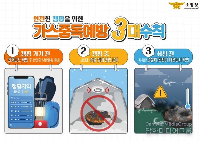이를 예방하기 위해서는 ▲캠핑 가기 전 최저온도 확인 후 안전한 난방용품 준비하기 ▲텐트 내 화기류 사용 금지 ▲캠핑 중 실내에 숯불 절대 반입 금지 ▲난방기기 사용 시 충분한 환기 확보 및 일산화탄소 경보기 설치 ▲취침 전 사용한 숯불이 완전히 꺼졌는지 확인 ▲ 소화기 비치 등 기본 안전수칙을 반드시 지켜야 한다.