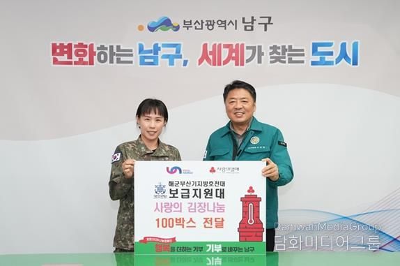 시민행정신문 강갑수 기자 | 해군작전사령부 부산기지방호전대 보급지원대는 지난 12월 4일, 부산 남구(구청장 오은택)에 사랑의 김장 나눔 봉사활동 일환으로 직접 담근 김장 김치 100박스를 전달했다.