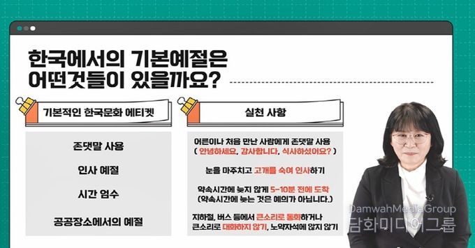 콘텐츠는 기본예절, 식당 및 공장 아르바이트, 생활안전(화재, 심폐소생술) 등 총 5차시로 구성되어 있으며, 안전분야 전문강사가 실제 사례 중심으로 강의를 진행한다. 또한, 영어·중국어·베트남어 등 3개 언어로 AI 더빙을 진행하여, 다양한 국적의 유학생들이 자막 없이도 쉽게 이해하고 학습할 수 있도록 제작됐다.