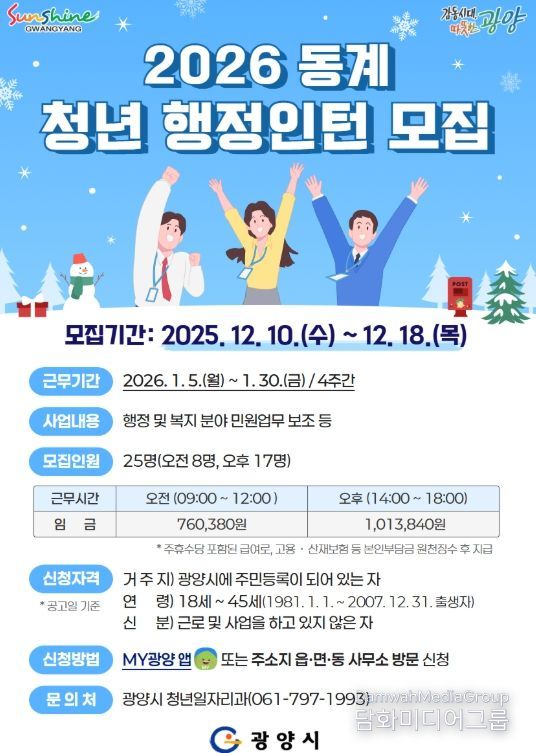 시민행정신문 강갑수 기자 | 광양시는 오는 12월 10일부터 18일까지 ‘2026년 동계 청년 행정인턴’ 참여자 25명을 모집한다고 밝혔다.