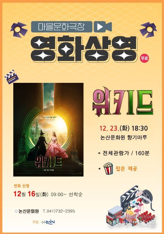 상영하는 영화는 지난 11월 재개봉한 판타지 영화‘위키드’로, 12월 23일 저녁 6시 30분 논산문화원 향기마루에서 상영한다.