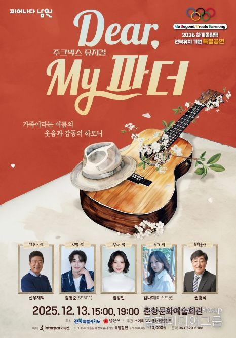 시민행정신문 강갑수 기자 | 대중가요와 올드팝 명곡으로 세대 갈등을 해결하고 부자간의 화해를 담아내는 주크박스 뮤지컬 'Dear My 파더'가 오는 12월 13일 남원 춘향문화예술회관 대공연장에서 오후 3시와 7시, 두 차례에 걸쳐 관객을 찾아간다.