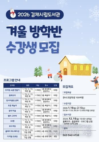 시민행정신문 강갑수 기자 | 김제시립도서관은 겨울방학을 맞아 관내 초등학생을 대상으로 겨울 독서교실과 겨울 방학반 프로그램을 오는 2026년 1월 12일부터 2월 13일까지 운영한다고 밝혔다