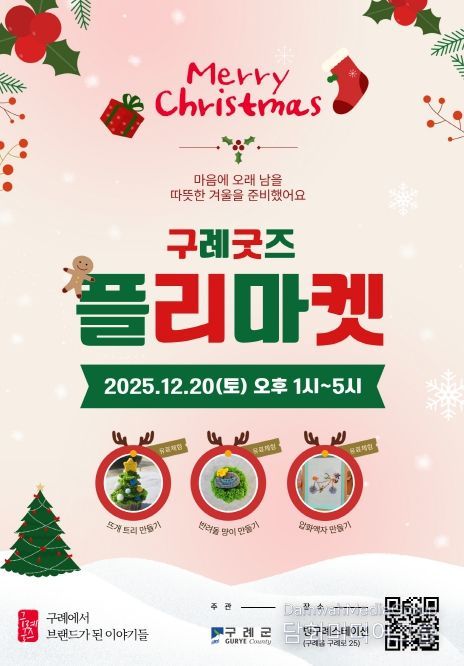 이번 행사는 12월 20일 오후 1시부터 5시까지 빙구례스테이션(구례읍 구례로 25)에서 진행되며, 로컬크리에이터 팝업전시와 연계해 지역 창작 콘텐츠를 더욱 폭넓게 즐길 수 있도록 구성된다.