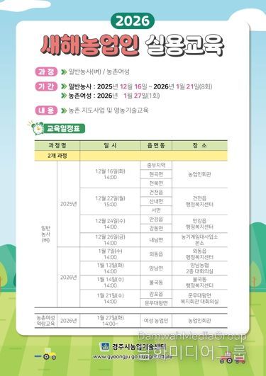 시민행정신문 강갑수 기자 | 경주시는 변화하는 농업환경에 신속히 대응하기 위해 오는 16일 벼농사 과정을 시작으로 ‘2026년 새해농업인 실용교육’을 내년 1월 27일까지 운영한다.