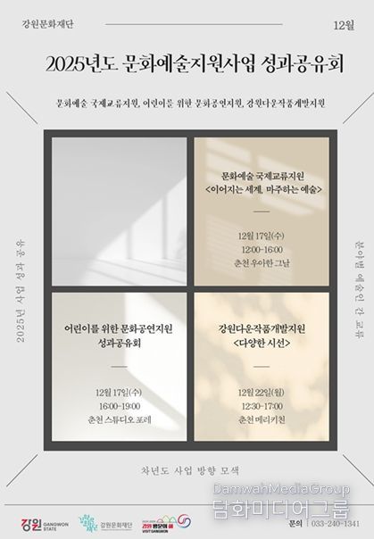 시민행정신문 강갑수 기자 | 강원문화재단은 2025년도 주요 예술지원사업에 참여한 예술인·예술단체와 함께 올 한 해의 성과를 나누고 2026년 사업 방향을 모색하기 위한 세 개의 성과공유회를 12월 중 순차적으로 개최한다.