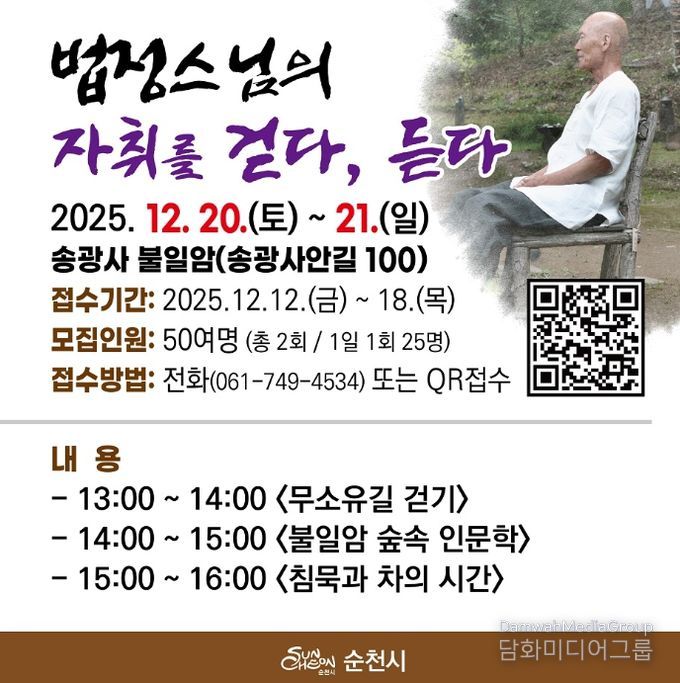 시 관계자는 “이번 프로그램을 통해 예비문화유산으로 선정된 ‘법정스님 빠삐용 의자’와 함께 법정스님의 정신을 공감하고 성찰하는 의미 있는 시간이 되길 바란다”며, “앞으로도 지역의 역사‧문화 자원을 활용한 시민 중심의 인문 프로그램을 지속적으로 운영하도록 노력하겠다”고 말했다.