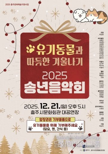 시민행정신문 기자 | 충주문화관광재단은 오는 12월 21일 오후 5시, 충주시문화회관 대공연장에서 '유기동물과 따듯한 겨울나기 2025 송년음악회'를 개최한다.