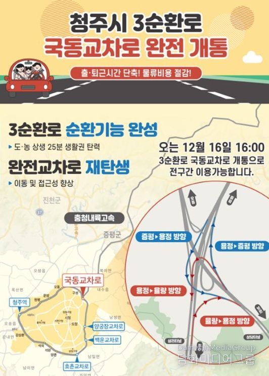 이로써 국동교차로는 증평·청주·보은 등 모든 방향으로 입체 연결이 가능해져 3순환로 순환기능이 완성됐다.