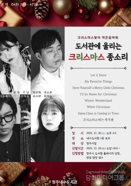 시민행정신문 강갑수 기자 | 청주내수도서관은 크리스마스를 맞아 이용자들에게 휴식과 위안을 전하고자 오는 20일 도서관에서 작은 음악회 ‘도서관에 울리는 크리스마스 종소리’를 운영한다.
