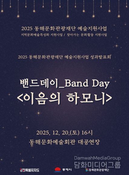 성과 보고 이후에는 지역에서 활발하게 활동하고 있는 ▲하얀민들레 ▲동해밴드 ▲제로이스트 ▲더캐럿츠 ▲밴드장수 등 5개 팀이 참여하는 연말 특별 공연 ‘이음의 하모니가’가 이어진다.