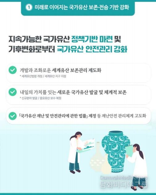 문화·자연·무형유산 각 유형별 특성에 따라 맞춤형 보존·관리를 추진하여 유산의 가치를 지켜나갈 것이다. 문화유산 수리 시, 실측설계기술자가 지속적으로 참여하는 ‘책임설계’를 도입해 수리 품질을 높이고, 공영수리 확대와 전통재료 비축을 통해 민간에서 주도하기 어려운 분야에 대한 공공지원을 강화한다. 또한, 올해로 준공 100주년을 맞은 '구 서울역사'의 철도유산으로서의 정체성과 역사(驛舍)로서의 주변시설 기능 연계·회복을 위한 보수·복원도 추진한다.