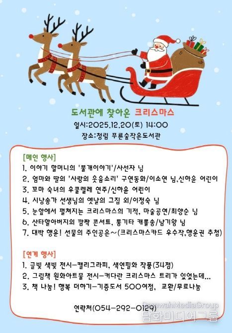 시민행정신문 강갑수 기자 | 포항시는 청림동 푸른숲작은도서관에서 20일 지역아동센터 이용 아동과 포항 지역 주민을 대상으로 연말 문화행사 ‘도서관에 찾아온 크리스마스’를 개최한다고 밝혔다.