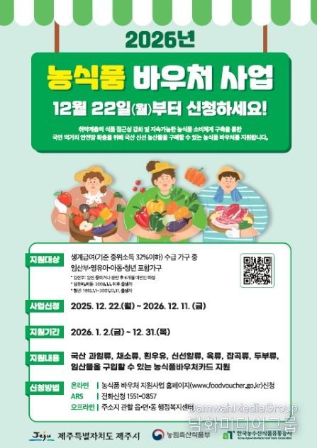 시민행정신문 기자 | 제주시는 취약계층의 식생활 안정을 지원하고 건강한 먹거리 접근성을 높이기 위해 ‘2026년도 농식품바우처 사업’ 신청 접수를 12월 22일부터 시작한다.