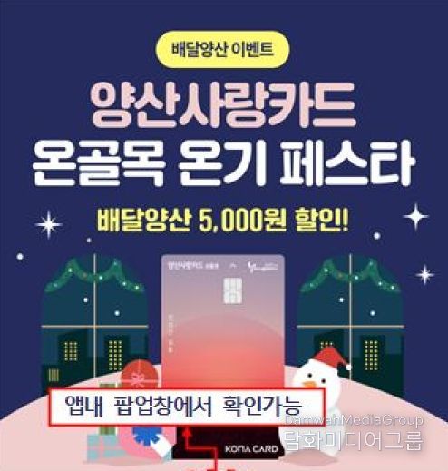이 행사는 시민들의 연말 소비를 양산사랑카드 사용으로 유도하여 소상공인 매출 증대에 실질적인 도움을 줄 것으로 기대된다. 먼저, 오는 12월 20일(토)부터 25일(목)까지 6일간 양산사랑카드 자체 배달 앱인 ‘배달양산’ 이용자를 대상으로 온기쿠폰을 지급한다.