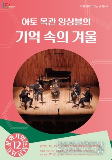 12월 문화가 있는 날 콘서트는 '아토목관앙상블의 기억 속의 겨울'로, 한 해를 마무리하며 시민들에게 감사의 마음을 전하는 따뜻한 무대로 마련됐다. 공연은 12월 27일 오후 5시, 안동문화예술의전당 백조홀에서 열린다.