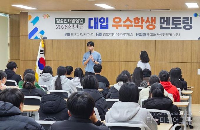 이날 멘토로 나선 청송인재양성원 수강생 이승용 학생(청송고/고려대 경영학과 26학번)과 장영선 학생(청송여고/경희대 사학과 26학번)은 멘토링에 참석한 후배 학생과 학부모를 대상으로 ▲내신 공부법 ▲수능 대비 학습 전략 ▲방학 활용 방법 ▲멘탈 관리 노하우 등 본인들이 직접 경험하며 터득한 공부 비법을 생생하게 전했다.