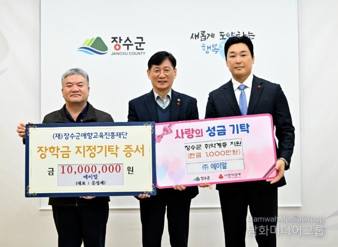 ㈜에이알은 지난 19일 장수군을 방문해 (재)장수군애향교육진흥재단에 장학금 1천만 원과 전북사회복지공동모금회를 통한 이웃돕기 성금 1천만 원 등 총 2천만 원을 기탁했다.