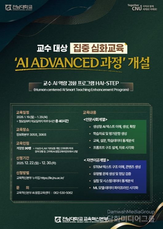 24일 전남대학교에 따르면, 전남대학교 교육혁신본부는 AI 대전환 시대에 선제적으로 대응하고 교수자의 AI 활용 역량을 강화하기 위해 ‘AI ADVANCED 과정’을 개설한다.