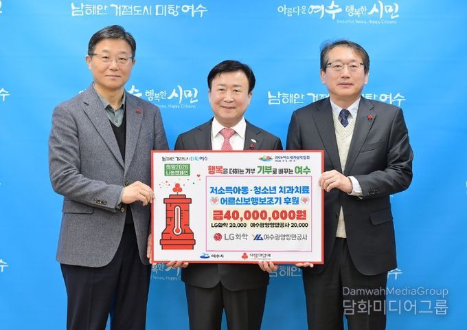시민행정신문 강갑수 기자 | 여수시는 LG화학 여수공장(주재임원 이현규)과 여수광양항만공사(사장직무대행 황학범)가 지난 23일 저소득 아동·청소년 치과치료 지원사업과 노인 보행 보조기 지원사업 추진을 위해 2천만 원씩 총 4천만 원을 후원하는 증서를 전달했다고 밝혔다.
