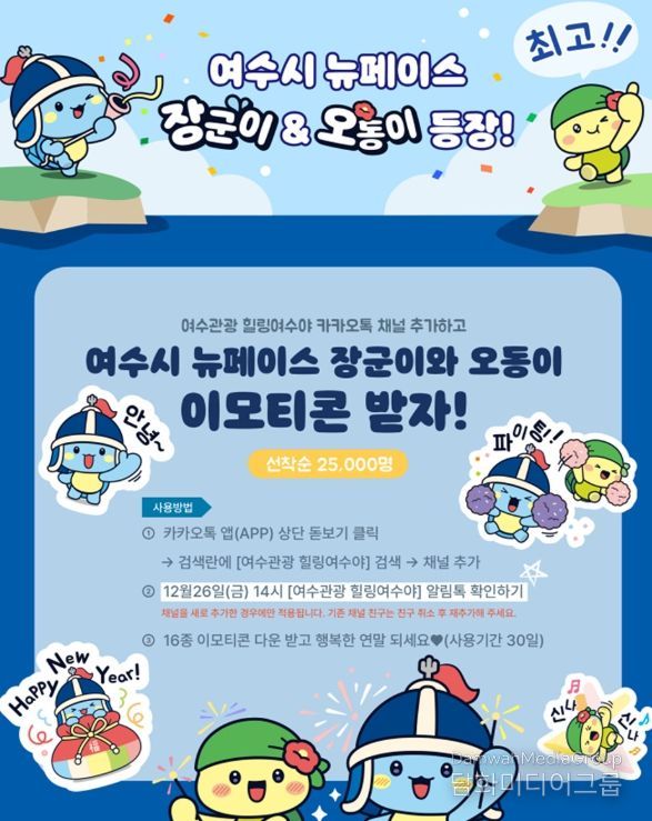 시민행정신문 강갑수 기자 | 여수시가 새롭게 리뉴얼된 마스코트 ‘장군이·오동이’ 카카오톡 이모티콘을 오는 26일 오후 2시부터 선착순 2만 5천 명에게 무료로 배포한다고 밝혔다.