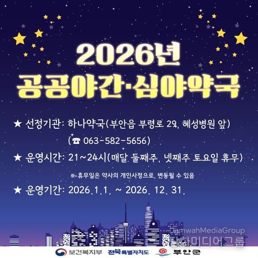 2026년 지정 공공심야약국은 하나약국(부안읍 부령로 29, 혜성병원 앞 위치)으로 매달 둘째‧넷째주 토요일을 제외하고 매일 밤 9시부터 12시까지(3시간) 심야약국을 운영한다.